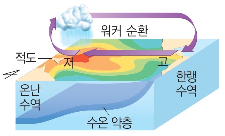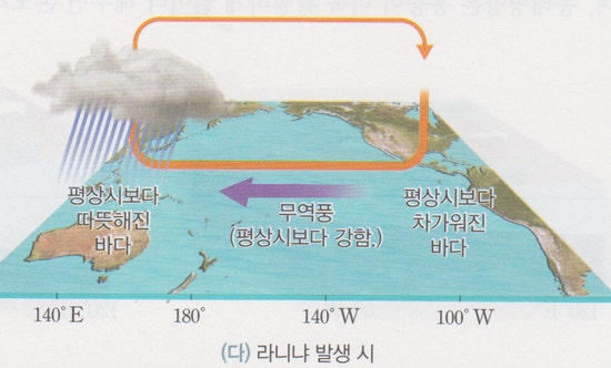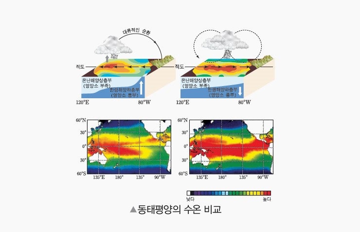 과학적 근거: 정상적인 해양 상태에서는 동태평양에 차가운 해수가 올라와(용승) 서태평양으로 흘러가고, 서태평양은 따뜻한 해수로 가득 차 있습니다. 이로 인해 서태평양 지역에는 저기압이 형성되어 비가 많이 오고, 동태평양에는 고기압이 형성되어 건조한 날씨가 이어집니다.