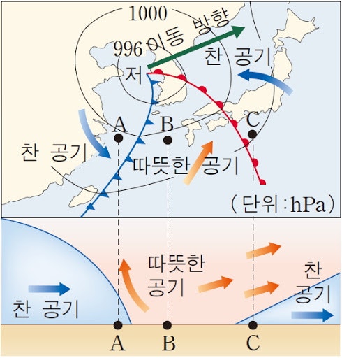 고·저기압에 따라 공기 덩어리가 이동하며,
