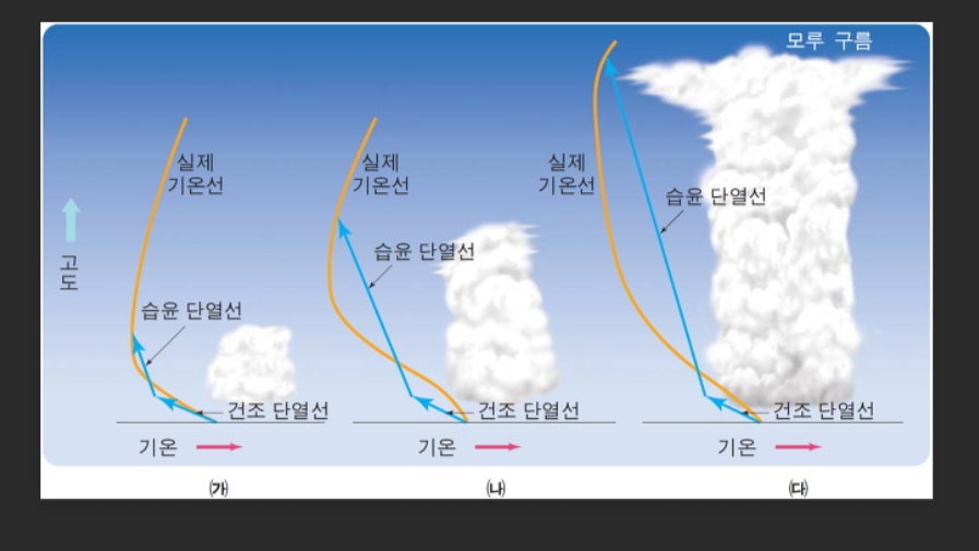 - 불안정(Unstable): ELR > DALR → 공기 덩어리는 상승할수록 주변보다 따뜻하고 가벼워져 계속 위로 올라갑니다.
