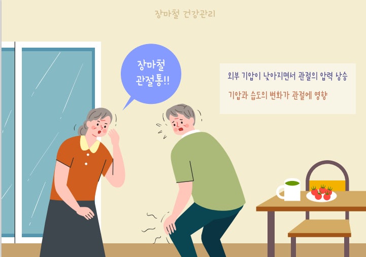 그래서 장마철이나 태풍 전 관절통이 심해지는 이유는 단순한 노화가 아니라 공기 밀도와 수분량 변화 때문입니다.
