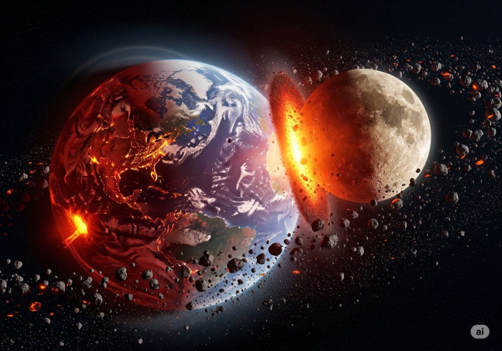 이 혼돈의 시기에, 화성 크기의 행성 ‘테이아(Theia)’가 원시 지구와 충돌합니다. 이 충돌로 튀어나온 물질이 모여 달이 만들어졌고, 지구의 자전과 기울기는 지금의 형태로 고정되었습니다.